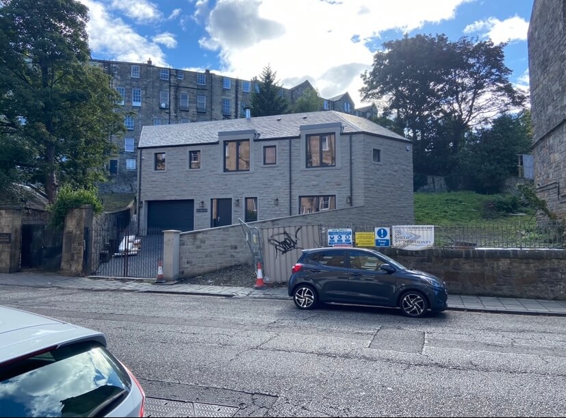 Sheed Stonemasonry constructed this new build garage in Morningside, working closely with our client to achieve a good project all round. Front elevation is sparrow dabbed ashlar and the gables and rear elevation is stugged buff walling along with broached surface finishes returns on the quoins and rybats. Stone type used was Witton Fell.